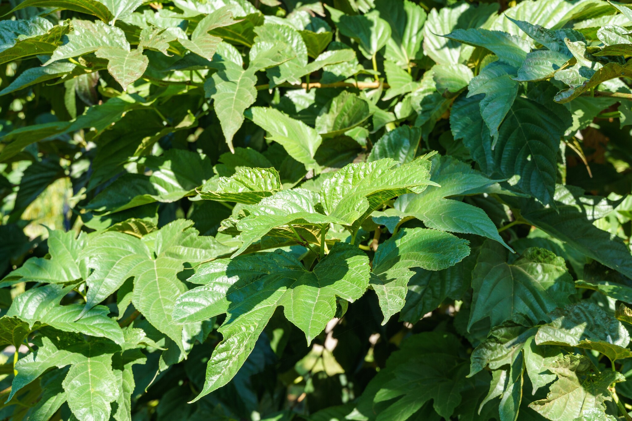 - Bladeren: De moerbei 'Fruitless' heeft glanzende, lichtgroene, grote, gepunte bladeren die in de zomer een weelderig groen bladerdak vormen. Dit maakt de boom niet alleen mooi om te zien, maar biedt ook veel schaduw.